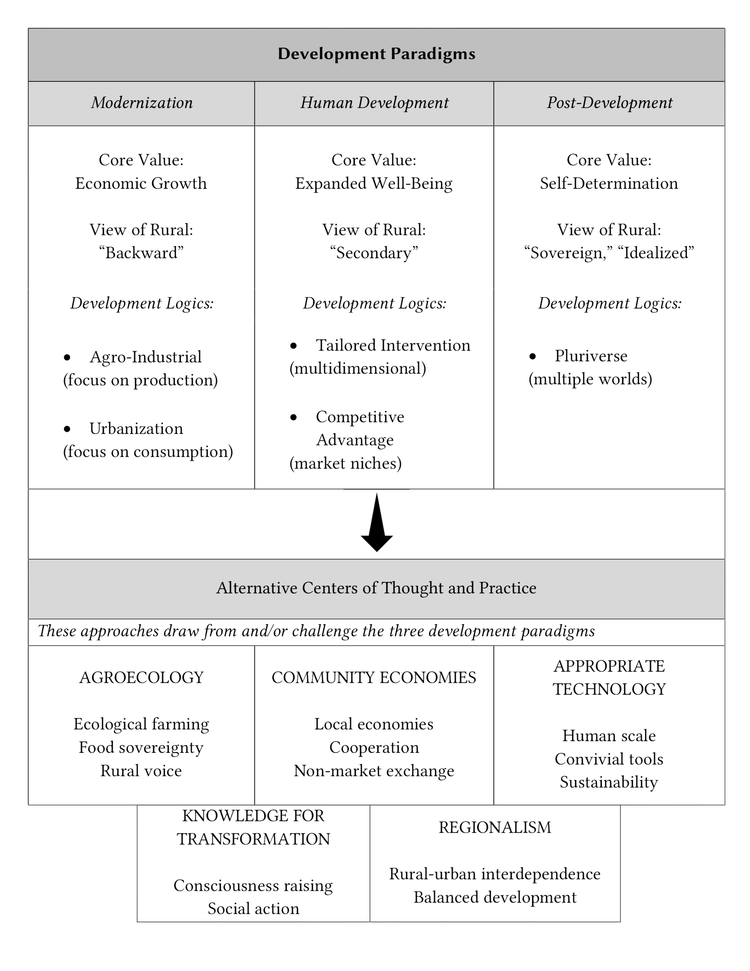 The modernization and human development paradigms are the dominant forces shaping development policy and practice today. However, there is a consolidated body of scholarly thought and social resistance to the foundational assumptions and methods of both paradigms. The post-development paradigm represents an entirely different way of thinking about rural transformation, one that rejects the very concept of development as materialistic, Western-centric, and inherently colonial. It rejects the industrial-capitalist logic of mainstream development strategies and focuses on protecting places and communities to advance endogenous, self-determined processes of social change.